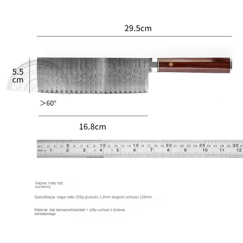 Stal damasceńska, kuta w tradycyjny sposób, jest nie tylko wyjątkowo odporna na zużycie, ale także ma długotrwałą ostrą krawędź. Każdy nóż jest dokładnie wypolerowany, aby zapewnić gładkie i precyzyjne cięcie.
